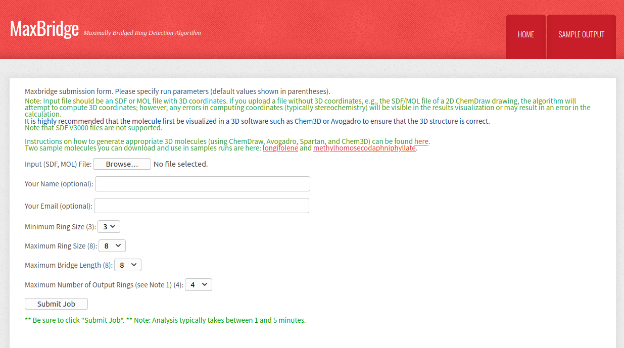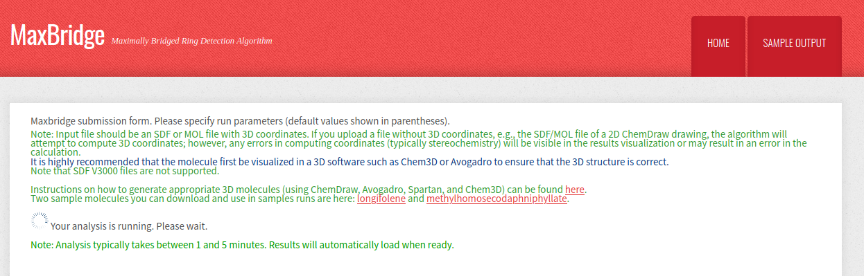 Go back to the MaxBridge web site, use browse to upload the morphine.mol file, then click "submit" in the bottom, and wait for 1-5 minites while the calculation happening.