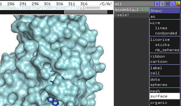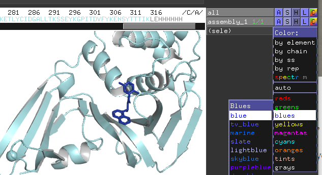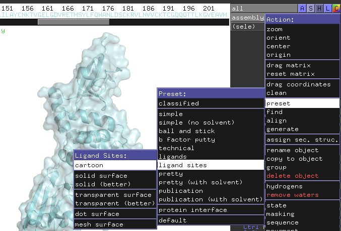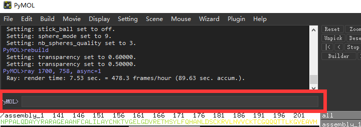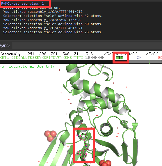type "set seq_view,1" press enter, the amino acids sequence with all the co-factors appears on the top of the image. If you click on the ligand in red box, the ligand name in the sequence will be highlighted, vice versa.