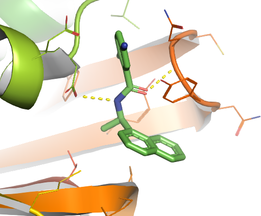 If we rotate a bit, there are two H-bonds formed between TTT and the coronavirous here as shown in yellow dashed lines.