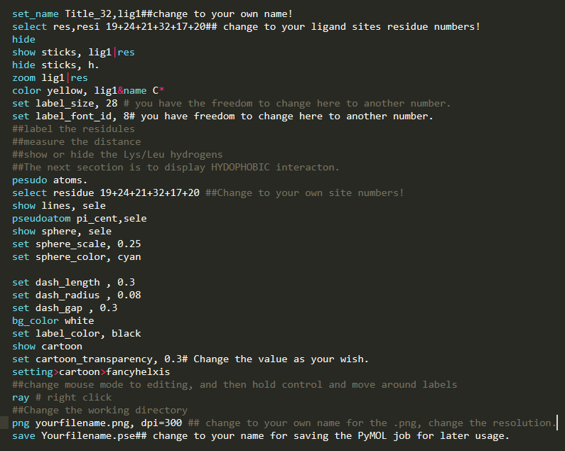 You properly noticed, the above image is still not perfect, but due to the limitation of this blog, I don't want to go further to overwhelm people, but starting from the last image, there are a lot of new commands we could apply, especially put more emphasis on the interaction between the small molecule and protein. An example picture attached here for those who want further leaning (The example) below is no longer based on the coronavirus protein, YOU NEED TO CHANGE IT BASED ON YOUR PROTEIN.Also, I provide here a pymol.sh script which can be used to write repeated PyMOL scripts .pml, when multiple proteins need to be processed in a high through manner. What you need do is just modify the .sh file a bit, then run this .sh in any terminal, there will be output.pml file then run this .pml with PyMOL, multiple proteins will be processed at one time