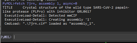 But here we just go to the "File" > "Get PDB" and a new window prompt asking you input the PDB ID, fill 7JRN, then click "Download". Alternatively you can type "fetch 7JRN" into the command line box, press Enter. Or, you can download the structure from 7JRN to your local computer then drag it into the PyMOL window.Get familiar with the command line.