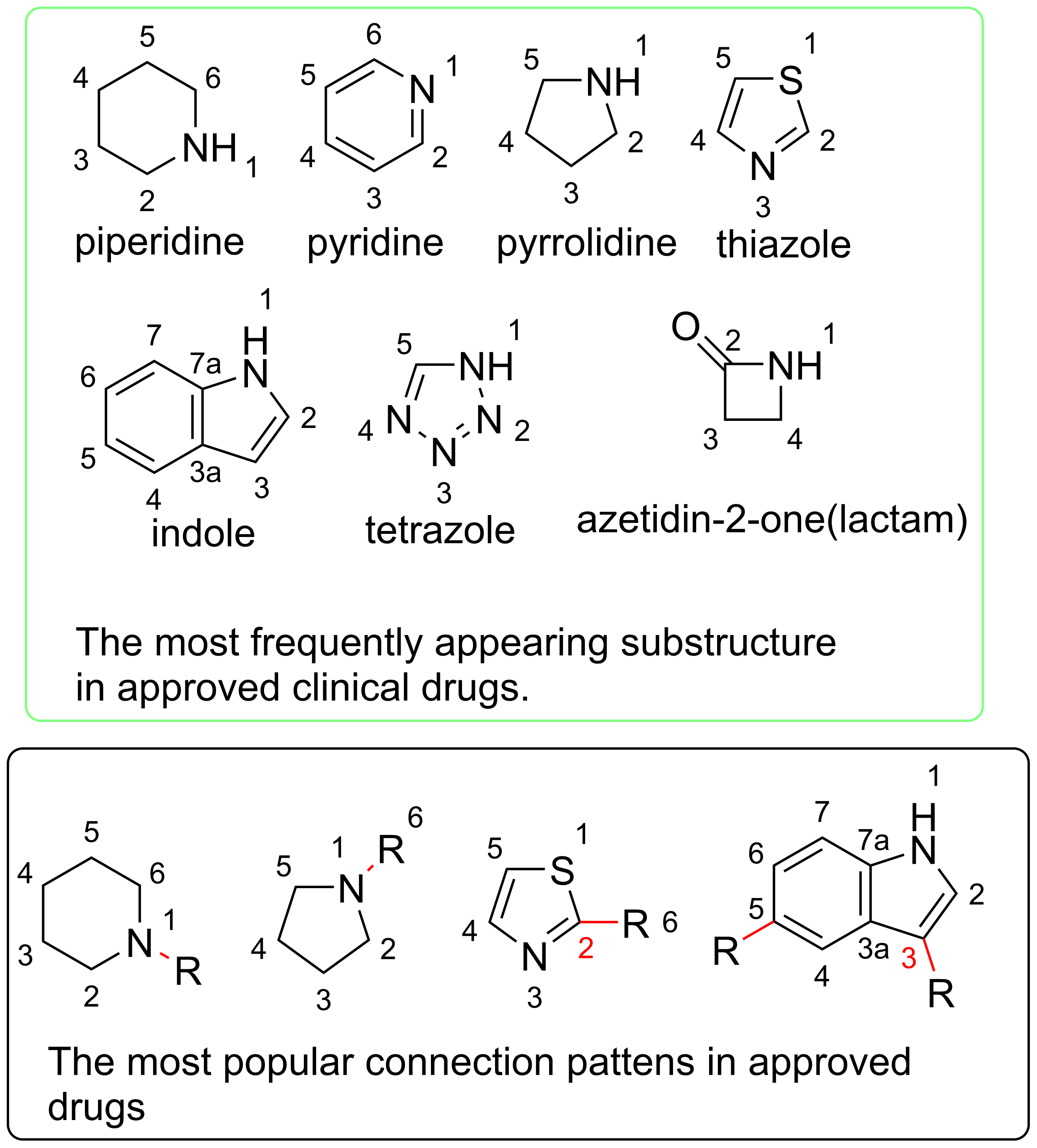 But let first have a look at the good ones, based on a paper published in 2014, CHEMICAL NEWS The Most Common Heterocycles in Drugs, published in Science, by Derek Lowe, the top heterocycles appeared in FDA approved drugs are list as the next image, from left to right, up to bottom.