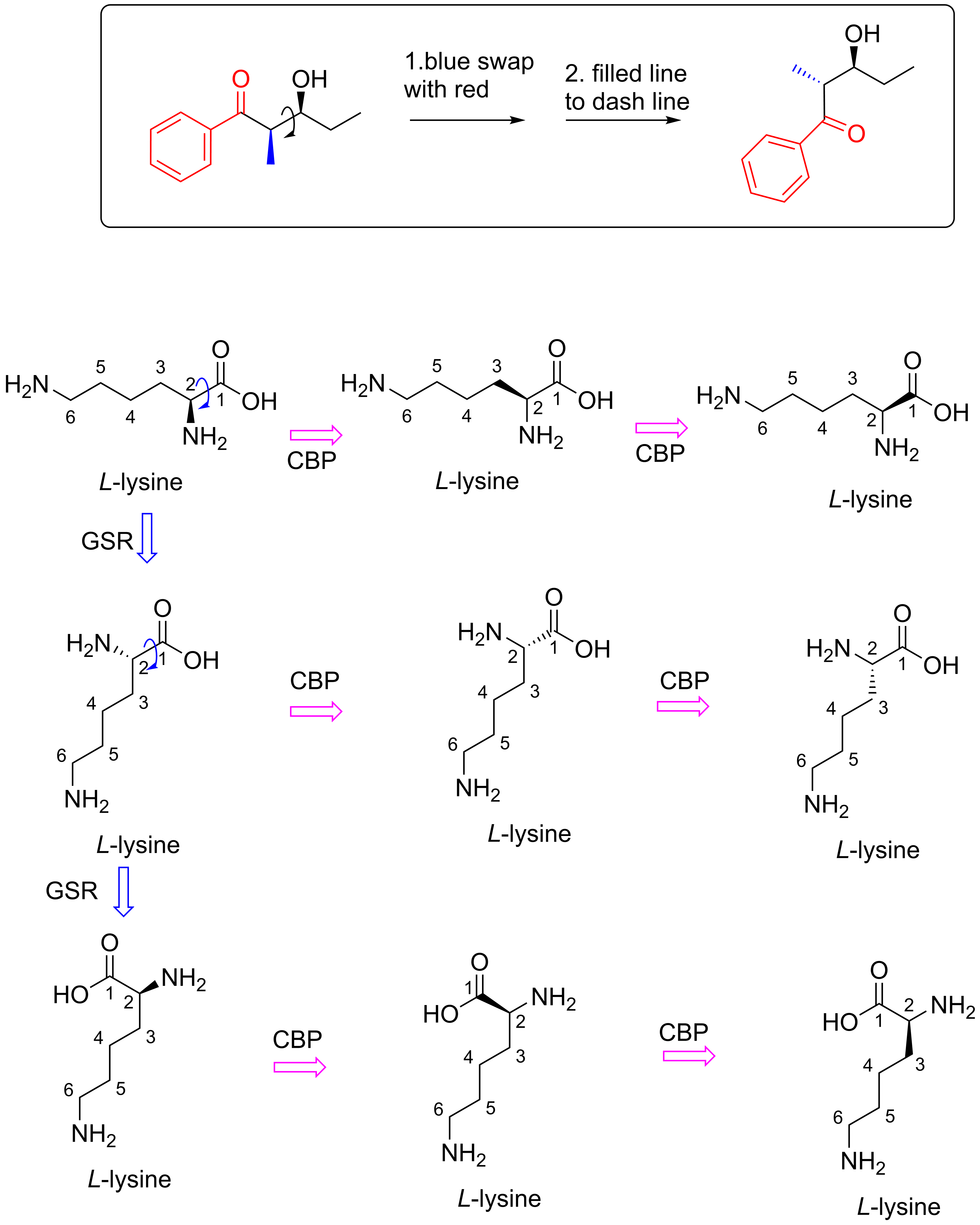 Two simple stereochemistry drawing tips are provided here. You will be surprised how easy it is to apply these methods drawing the same molecule in so many ways! The next image shows many molecules, they all mean the same L-lysine. By applying two tips called CBP and GSR, you can do this easily too.