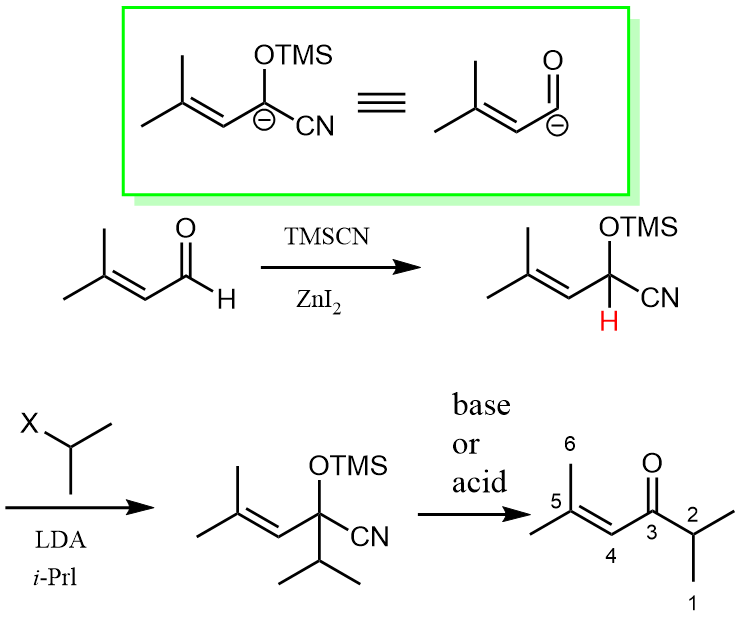 As the above green box shows, we take the TMSCN masked anion as an acyl anion equivalent in practice. The reason why this could work nicely is partly due to the strong electron-withdrawing nature of the CN group, which can stabilize the negative charge after LDA deprotonation.